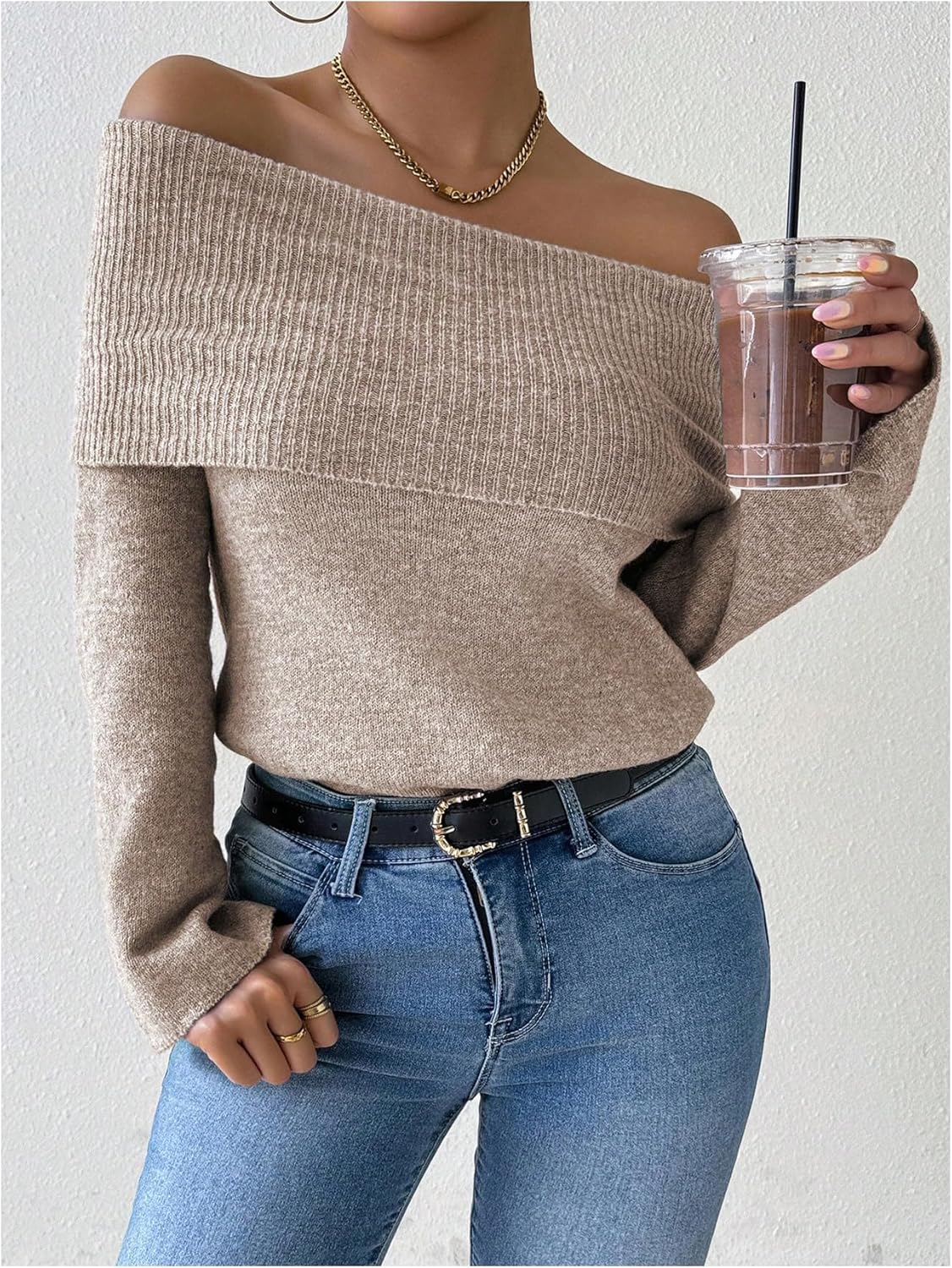 - Features: Solid, off shoulder, flared sleeve, slim fit, long sleeve fall sweater for women